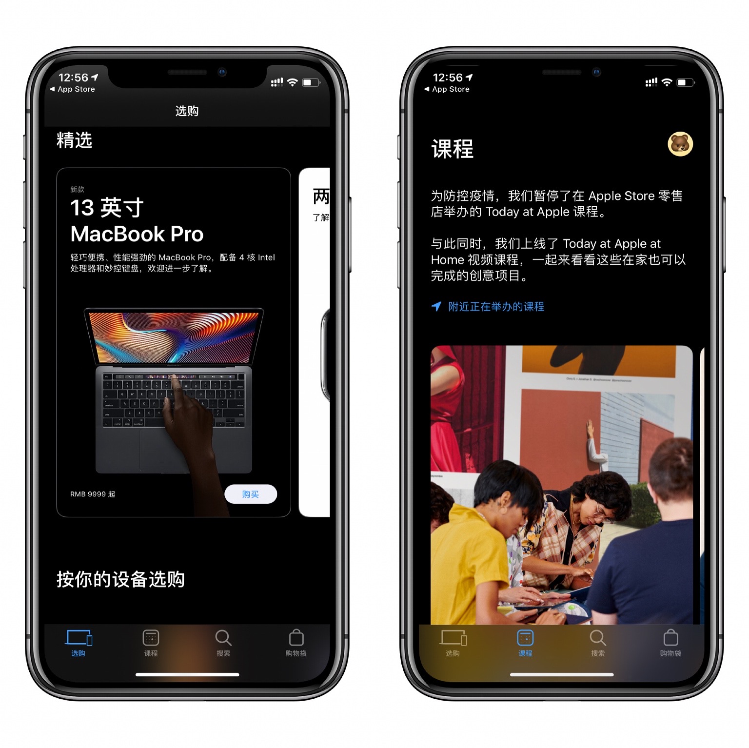 当你在控制中心打开深色模式的开关后,Apple Store 的界面就会跟着切换为黑色背景的深色模式。