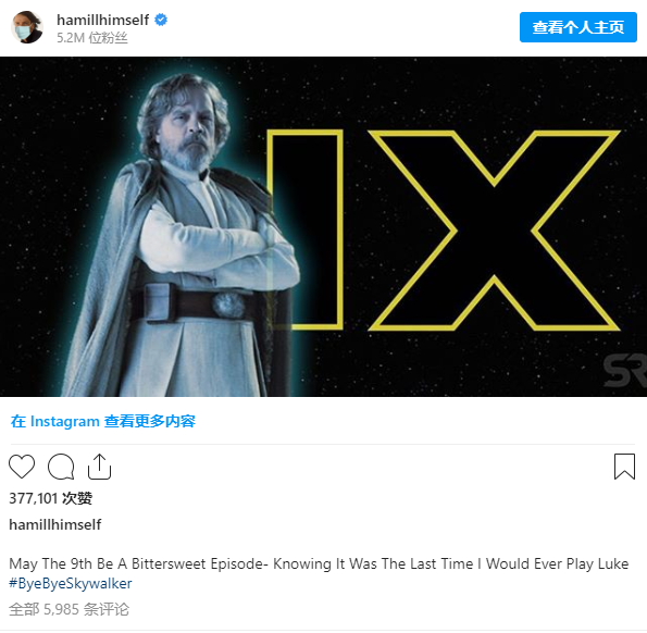 在《星战9》上映后不久Mark Hamill就写过一封真情流露的致粉丝信,信中感谢了粉丝对整个天行者故事和星球大战宇宙的贡献,并指出“随着新生代主角整个《星战》宇宙会更加庞大”。