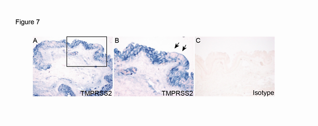 图6:结膜手术标本的TMPRSS2表达及定位。(A)框中的区域在(B)以较高的放大倍数显示。C为正常IgG对照组。