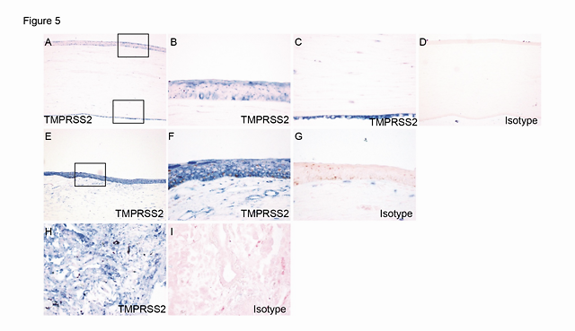 接下来,研究人员用免疫组化方法检测了TMPRSS2在死后眼角膜中的表达和定位。他们发现,TMPRSS2在所有标本的角膜、角膜缘和结膜上皮层显示出一致的强染色。与ACE2相比,TMPRSS2的染色强度更高。