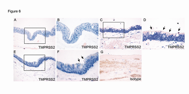 图5:死后眼球结膜的TMPRSS2表达及定位。图中展示了2个眼球的结膜(A-B,C-D,E-F)。箭头表示杯状细胞(D,F)。