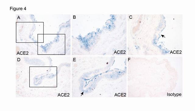 研究人员随后通过对10个死者眼标本的免疫组化方法确定了ACE2在角膜中的定位。他们发现,ACE2染色在角膜上皮呈阳性,角膜上皮的基底细胞和最浅层细胞呈轻度至中度染色。在某些样本中,角膜缘ACE2的染色强度比邻近的角膜上皮强。类似的,研究也确认了ACE2在结膜上皮表达,在许多标本中,ACE2染色在大多数浅表层上皮细胞中尤为明显。