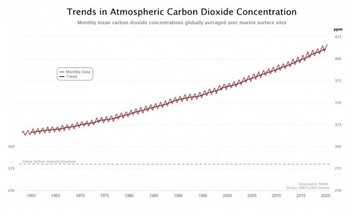 在20世纪60年代,当碳浓度在300ppm以下时,水平以每年0.9ppm左右的速度逐渐上升。而2010年至2019年期间,浓度以每年2.4ppm的速度上升,表明上升趋势只是在加速。