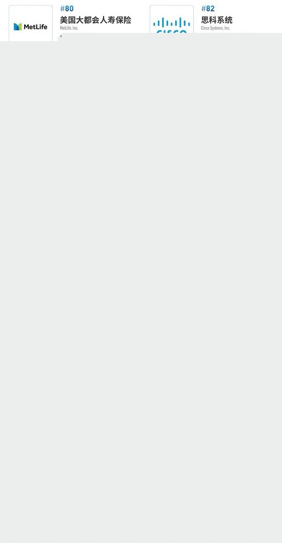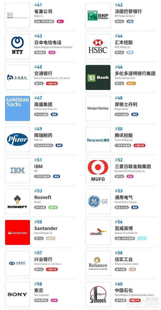 榜单前部还有其他中企,“四大行”均打入前十名,其中中国农业银行名列第5位,中国银行名列第10位。