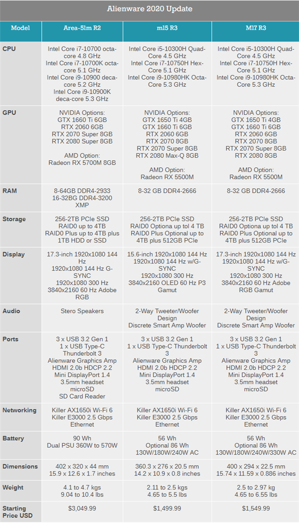 最后看看Alienware m15 R3、Alienware m17 R3,分别为15.6寸、17.3寸游戏本,屏幕可选1080p-4K各种分辨率、60-300Hz各种刷新率,可选Tobii眼球追踪技术。
