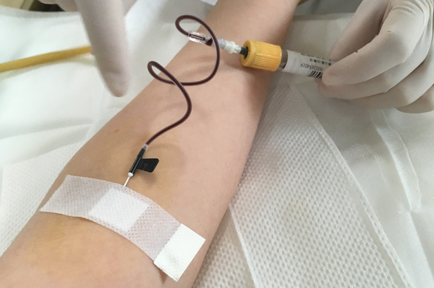 ▲刚抽完血,就在外边找个通风地方戳手指了
