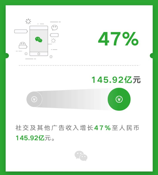 其中,社交及其他广告收入同比增长 47% 至人民币 145.92 亿元,主要由于移动广告联盟及微信朋友圈因广告库存及曝光量增加而实现收入增长。
