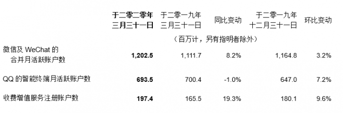 微信及 WeChat 的合并月活跃帐户数达 12.02 亿,比去年同期上涨 8.2%。
