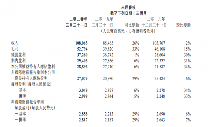 Q1 总营收为 1080.65 亿元,同比增长了 26% ;