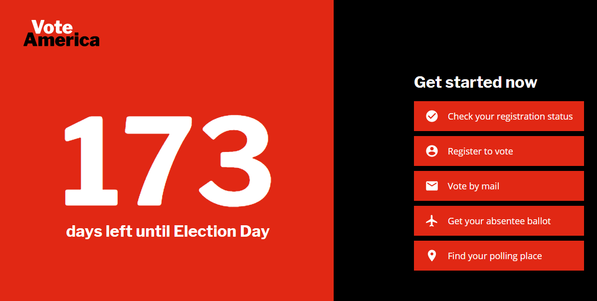 由于美国各州在进行选举,因此该组织的核心任务是通过全国性的投票登记系统来帮助选民。在这个简单的网站上,访问者可以注册投票,检查他们的注册状态,找到投票地点,请求缺席选票或通过邮件注册。