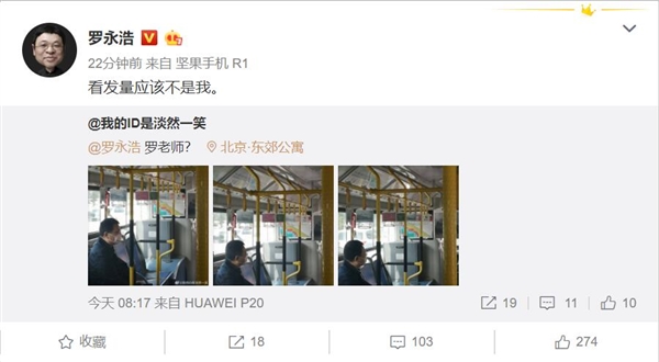 一位网友在北京公交车上偶遇一位面相神似锤子科技CEO罗永浩的人,这位网友发微博并@罗永浩求证。罗永浩本人表示,看发量应该不是我。网友纷纷留言,表示这位乘客跟罗老师太像了。