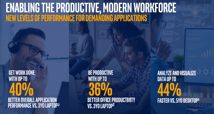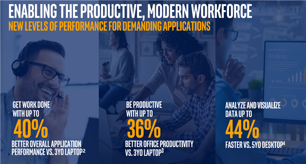 Intel表示,相比于三年前的旧笔记本,新博锐平台总体性能提升高达40%,办公效率提升高达36%,而相比于五年前的旧台式机,数据分析和可视化速度提升高达44%。