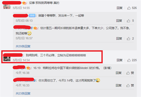 有意思的是,关注特斯拉的网友很熟悉宣布不降价是其一贯的套路,并在微博下方留言,“立帖为证,不出三个月,国产Model 3长续航版肯定会降价”,没想到被其一语中的成为神预言。
