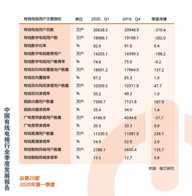 格兰研究最新发布的《2020年第一季度中国有线电视行业季度发展报告》显示,截至2020年一季度,有线数字电视缴费用户为1.42亿户,净减196.2万户。此外,广电宽带用户首次现逆增长。报告显示,今年一季度,我国有线电视用户总量净减310.4万户,降到了2.06亿户,有线电视在用户家庭电视收视的份额降至45.58%。