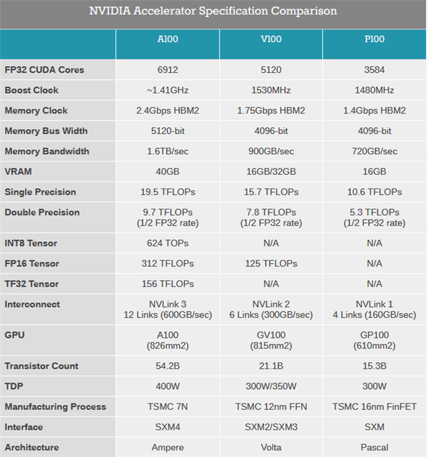 频率方面,A100核心实际上还倒退了,从V100的1530MHz降低到了1.41GHz左右,毕竟核心规模实在太大,功耗已经飙到了400W,比V100的300/350W功耗高出不少。