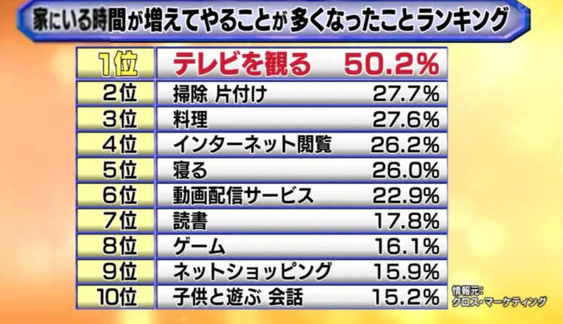 因为疫情缘故,世界都在大隔离当中。不少网友宅在家无所事事,也有的开始居家办公。最近日本节目月曜夜未央(月曜から夜ふかし)在这个礼拜就专做做了一个调查,就是人们“在家会做的事TOP10”,看看网友们宅家都会做些什么,你是不是也中枪了呢?