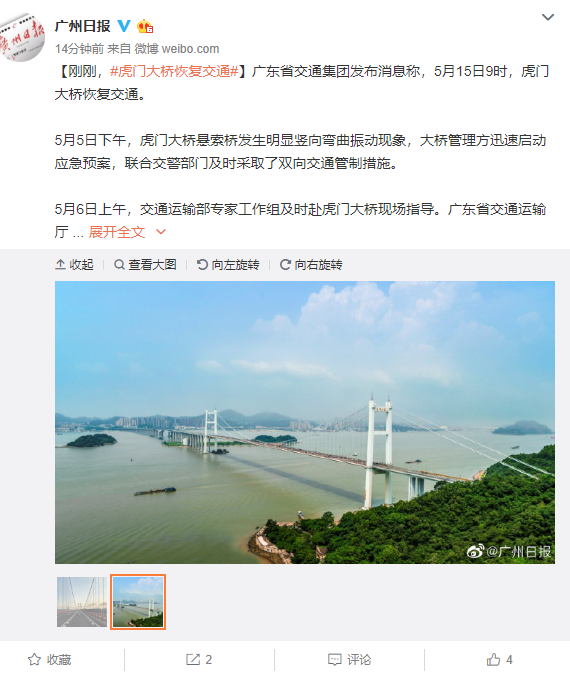 5月13日晚,在虎门大桥悬索桥恢复交通评估会上,特邀专家组认为,虎门大桥悬索桥结构安全,大桥管理方已采取抑振措施,并落实恢复交通前的准备工作,同意恢复交通运营。
