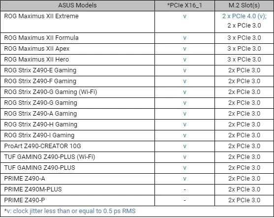 近日华硕对他们Z490对PCI-E 4.0的支持情况提供了一份声明,大概意思是Intel已经确认他们的第十代酷睿处理器以及Z490芯片都不支持PCI-E 4.0,所以目前没有任何可支持PCI-E 4.0的CPU来验证Z490对PCI-E 4.0的兼容状况,所以华硕不会主动宣传未经过合作伙伴认可的任何技术规格与功能。但可以告知的是,在一般的常见PCI-E信号策略分析中,华硕大部分的Z490主板抖动测量都通过了≤0.5 ps RMS的PCI-E 4.0测试标准。