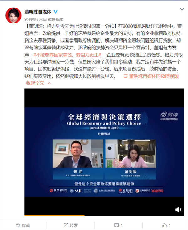 天气炎热,空调销售进入旺季。这段时间,格力董事长董明珠的出镜率也频频增加,包括连多场直播活动,参与访谈节目等。董明珠一向敢说,所以最近也是“金句”频出。在2020凤凰网财经云峰会中,董明珠发声,格力到今天为止没要过国家一分钱。