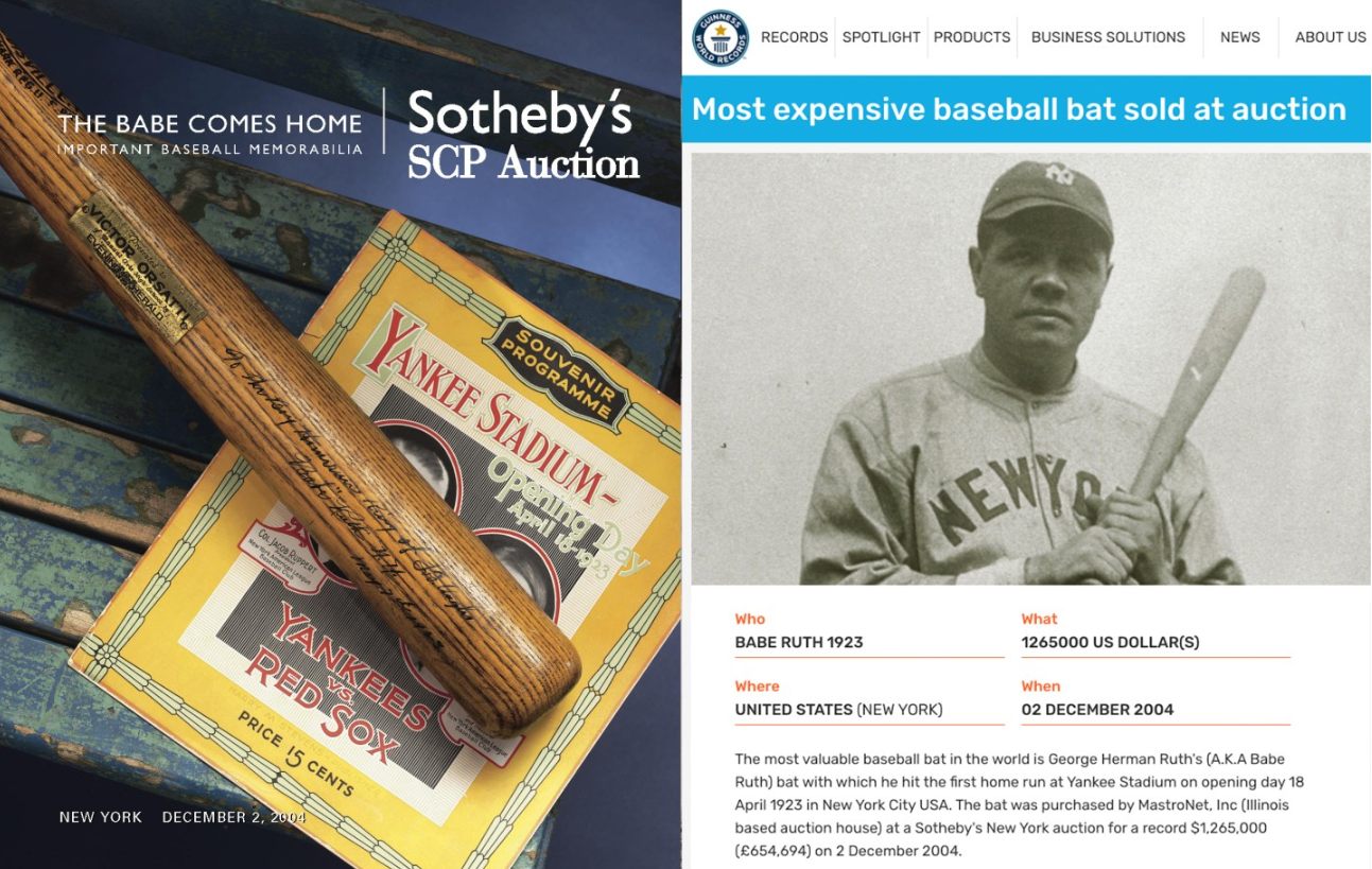 虽然这支1924年贝比-鲁斯击出的1924年第一支全垒打的棒球棒没能卖出,但它在2018年12月1日与米尔斯拍卖公司(Mears Auctions)合作拍卖时,以300万美元的底价创下了有史以来所有棒球棒的最高底价)。这支球棒是由贝比·鲁斯(Babe Ruth)亲笔签名的。随后,这支球棒被送到了Heritage Auctions拍卖行,以较低的200万美元起拍价拍卖,但它再一次没能成交。
