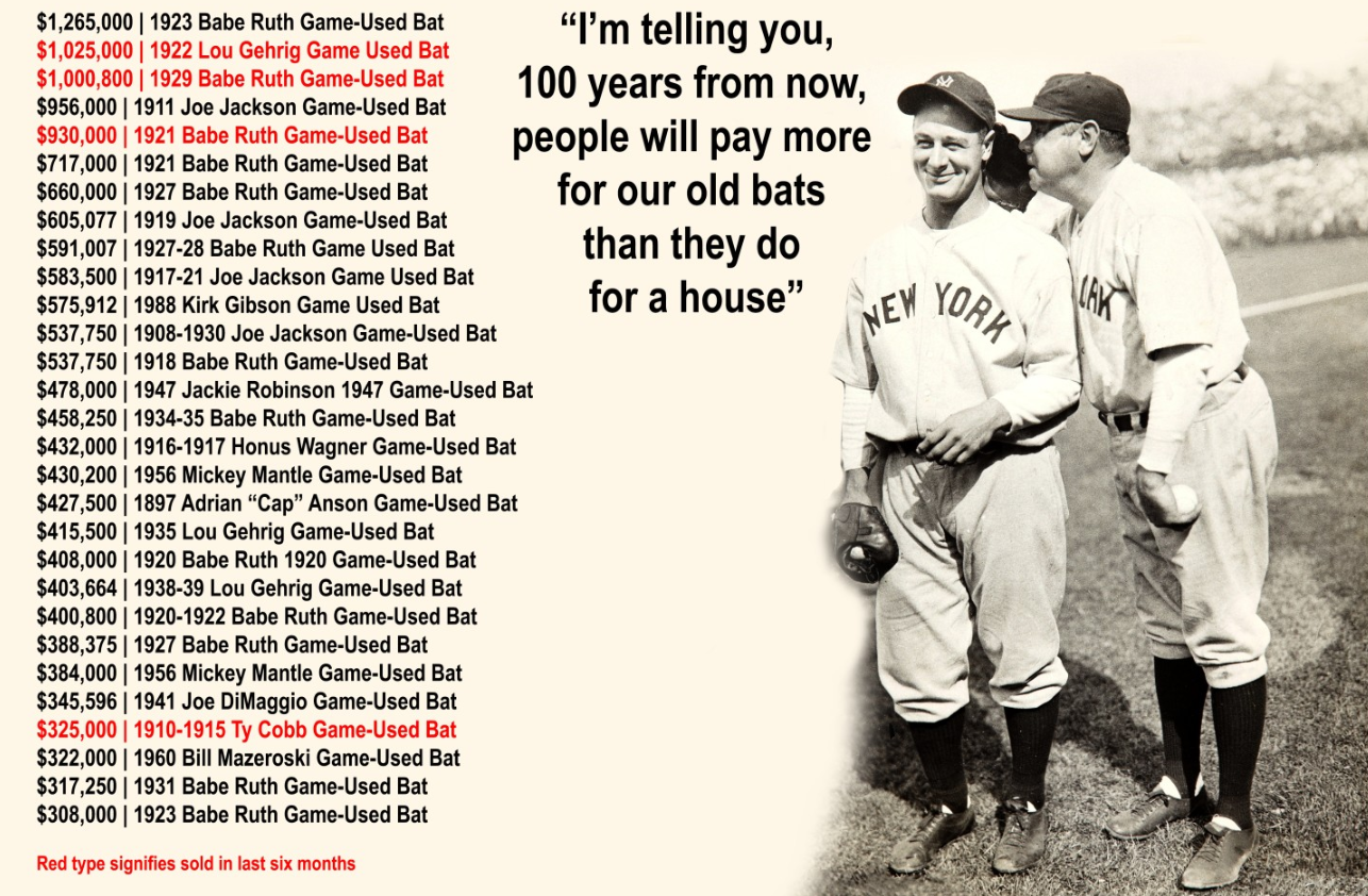 2月23日,一支由Lou Gehrig使用过的有98年历史的Hillerich & Bradsby棒球棒以102.5万美元的价格成交,去年12月,另一根由贝比·鲁斯在比赛中使用过的Hillerich & Bradsby棒球棒以100.08万美元的价格成交。