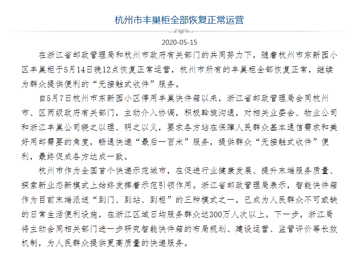 5月15日,浙江省邮政管理局发布消息称:在该局和杭州市政府有关部门的共同努力下,随着杭州市东新园小区丰巢柜于5月14日晚12点恢复正常运营,杭州市所有的丰巢柜全部恢复正常,继续为群众提供便利的“无接触式收件”服务。