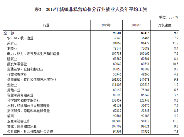 5月15日,国家统计局发布2019年平均工资。2019年全国城镇非私营单位就业人员年平均工资为90501元,比上年增长9.8%,扣除价格因素,实际增长6.8%。