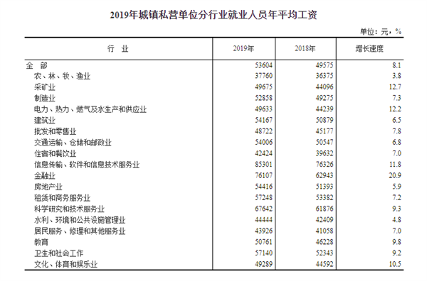 2019年城镇私营单位就业人员年平均工资为53604元,比上年增长8.1%,扣除价格因素,实际增长5.2%。