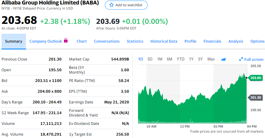 中国国家统计局星期五发表报告称,4月份实物商品电商销售额增长16%,高于3月份的11%和1、2月份的3%。Raymond James分析师亚伦·凯斯勒(Aaron Kessler)星期五发表投资报告称,“根据这一数据,我们增强了对阿里巴巴6月份季度业绩预期的信心。我们维持对阿里巴巴股票‘强烈买入’的评级。”阿里巴巴计划5月22日股市开盘前发布3月份季度财报。分析师预期,阿里巴巴营收将增长9%至152亿美元,调整后每股收益将减少34%至85美分。昨晚,京东发布了营收、利润双双超过分析师预期的第一季度财报。今天京东股价上涨3.9%。今天常规交易中,阿里巴巴股价上涨2.38美元,涨幅为1.18%,报收于203.68美元,高于50天和200天均线。阿里巴巴股价在1月13日达到231.14美元的有史以来新高,然后在3月中旬跌至6个月低点。阿里巴巴上个月宣布未来3年将对云服务业务投资280亿美元。与亚马逊相似,阿里巴巴在大举进军食品领域,日趋重视实体零售业务。今年以来,阿里巴巴股价下跌约5%。