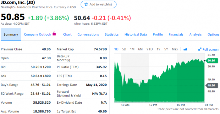 由于疫情期间用户增长,京东昨晚发布了业绩好于预期的第一季度财报,京东股价创下新高。京东营收增长21%至206亿美元,但利润下跌15%至每股28美分。华尔街对这两个数据的预期分别是193亿美元和10美分。京东预计第二季度营收将介于253亿至275亿美元之间,增幅介于20%至30%之间。今天常规交易中,京东股价上涨1.89美元,涨幅为3.86%,报收于50.85美元。第一季度末京东年度活跃用户为3.874亿,比上年同期增长25%,手机活跃用户增长46%。今天股价上涨,使得京东股价接近,有时甚至略高于2018年初的有史以来高点。今年以来,京东股价上涨了42%。在网络零售以及向第三方提供的物流服务增长驱动下,京东经营费用增长20%至1750亿美元。过去数年,京东每季度都实现了两位数的增幅。