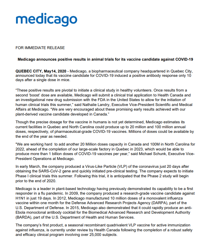 利用其在魁北克省和北卡罗来纳州的设施,到2022年,Medicago公司可以生产出高达1.2亿剂的产品。魁北克省的一个更大的工厂一旦在2023年建成,每年可生产10亿剂COVID-19疫苗。“假设疫苗通过了监管部门的批准,到今年年底,数百万剂量的疫苗就可以根据需要准备好。” 然而,这些只是估计,因为人类的适当剂量还没有确定。