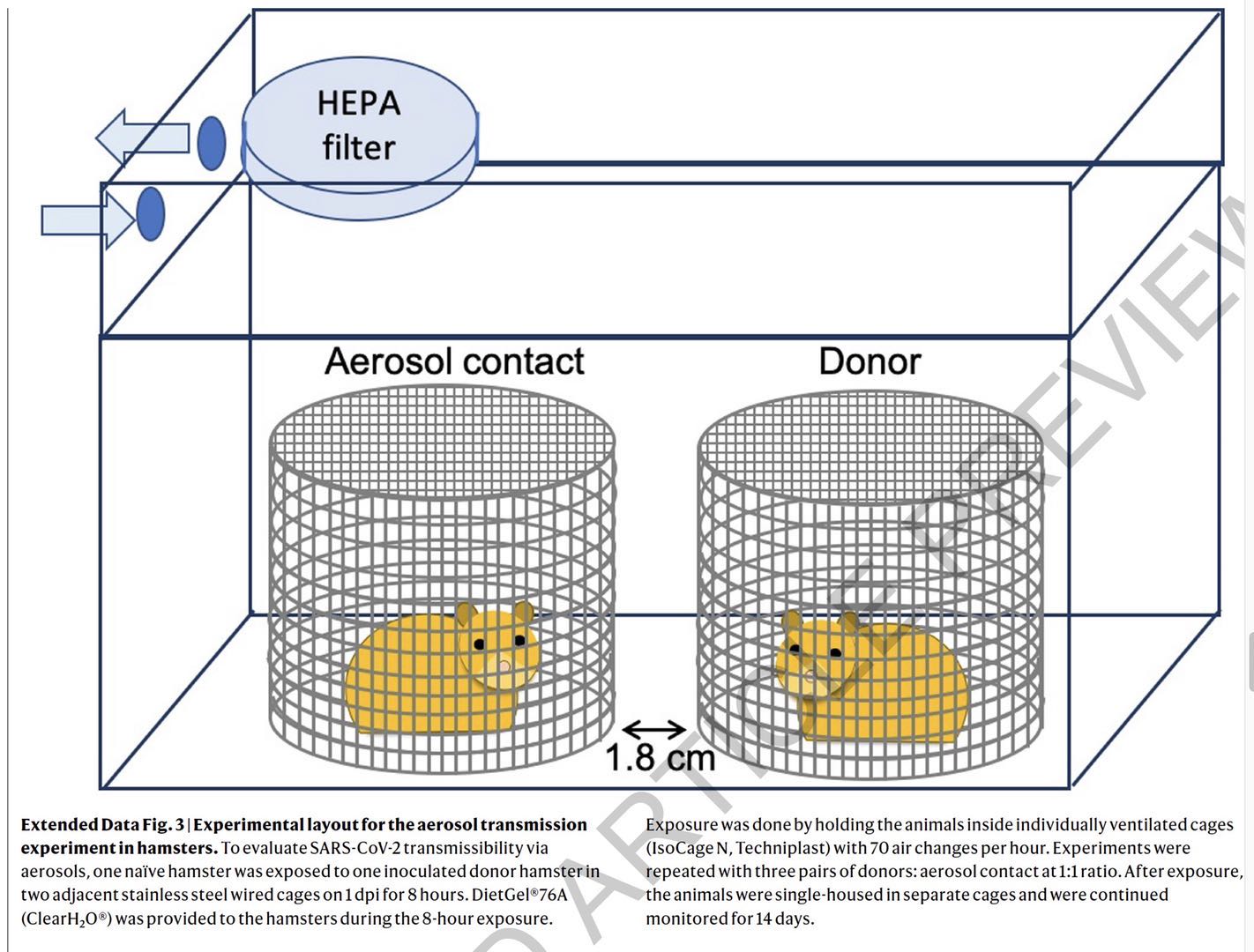 为了研究SARS-CoV-2在仓鼠中通过气溶胶的传播能力,研究者将供体(接受新冠病毒接种)仓鼠和幼稚仓鼠(健康仓鼠)分别放在两个相邻的铁笼中,在供体仓鼠接种病毒后1天,将两个笼子共同放置8小时,该实验如下: