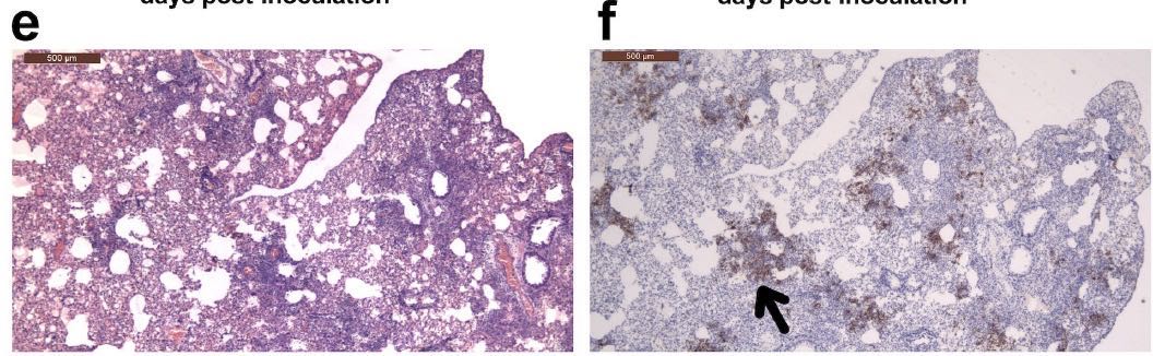 组织病理学检查发现,在接种病毒后2天,有5-10%的肺中炎性细胞增多和实变。