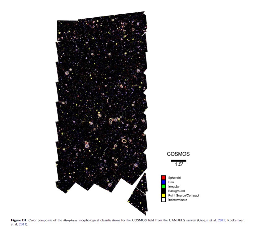 与其他大型深度学习模型的训练过程类似,研究人员向模型“投喂”了大量学习资料。主要是哈勃太空望远镜提供的CANDELS巡天观测资料,由数十位专业天文学家进行分析归类,总共分成约10000个星系类目。