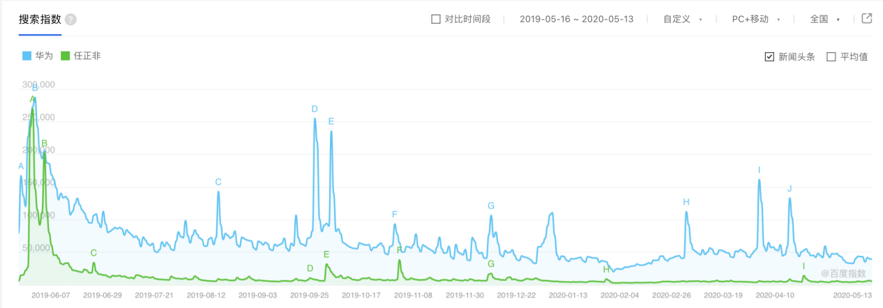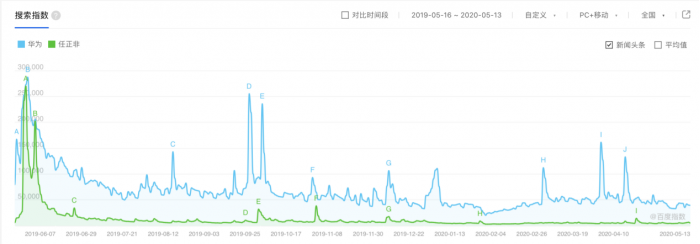 据新京报、腾讯新闻大数据统计显示,任正非在这20多万字的采访中,提到频率最高的词就是美国、特朗普、孟晚舟、谷歌、苹果、5G、后门、接班人等问题,里面不乏尖锐直接的问题,但任正非均以巧妙幽默的方式化解,或者正能量满满,每次采访必上热搜,也会给华为带来更大关注度。这一点从百度指数可以看出,每次任正非采访内容的曝光,“华为”关键词就会走向小高峰。