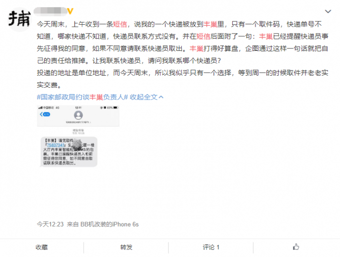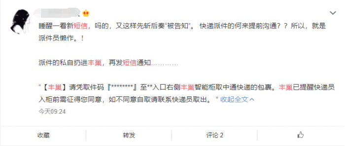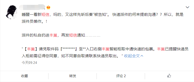 甚至有网友只收到了一个取件码,“快递单号不知道,哪家快递不知道,快递员联系方式没有。并在短信后面附了一句:丰巢已经提醒快递员事先征得我的同意,如果不同意请联系快递员取出。”