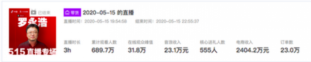 5月15日的直播中,罗永浩变身吃播,不过观众峰值人数31.8万,远不及首次。直播两个小时后,直播间观看人数降为24.2万,而在直播结束之前,直播间观看人数仅剩7万。