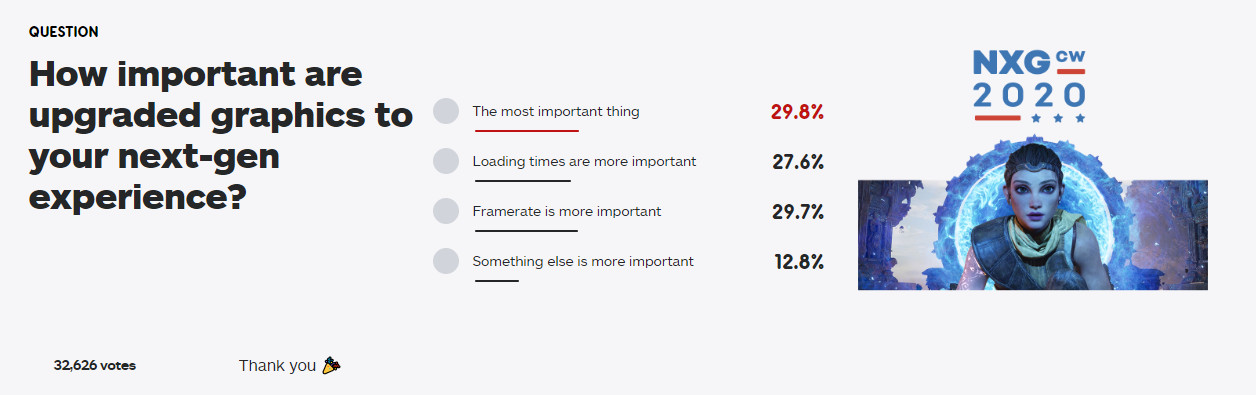 日前IGN在官网上发布了一个读者调查,询问“画面升级对于世代游戏体验有多重要”,配有四个答案,分别是:(升级画面)是最重要的事情,载入时间更重要,帧数更重要,以及其他。