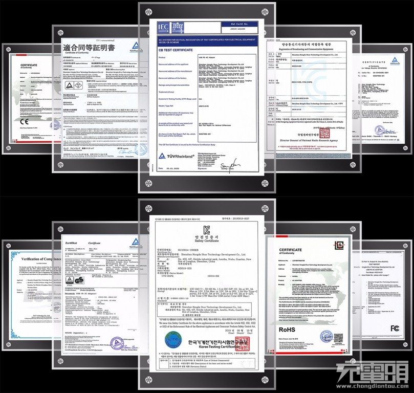 此前在CES2020展会上报道过一款鸿达顺展出的100W 五口USB PD快充充电器,性能十分强悍,获得不少网友关注。近期,该款100W 3A2C快充充电器已经实现量产, 并且拿到了FCC、CE(TUV)、RoHS、KC、GS、CB、BS、PSE、SAA等认证,可直接销往欧美及日韩市场。
