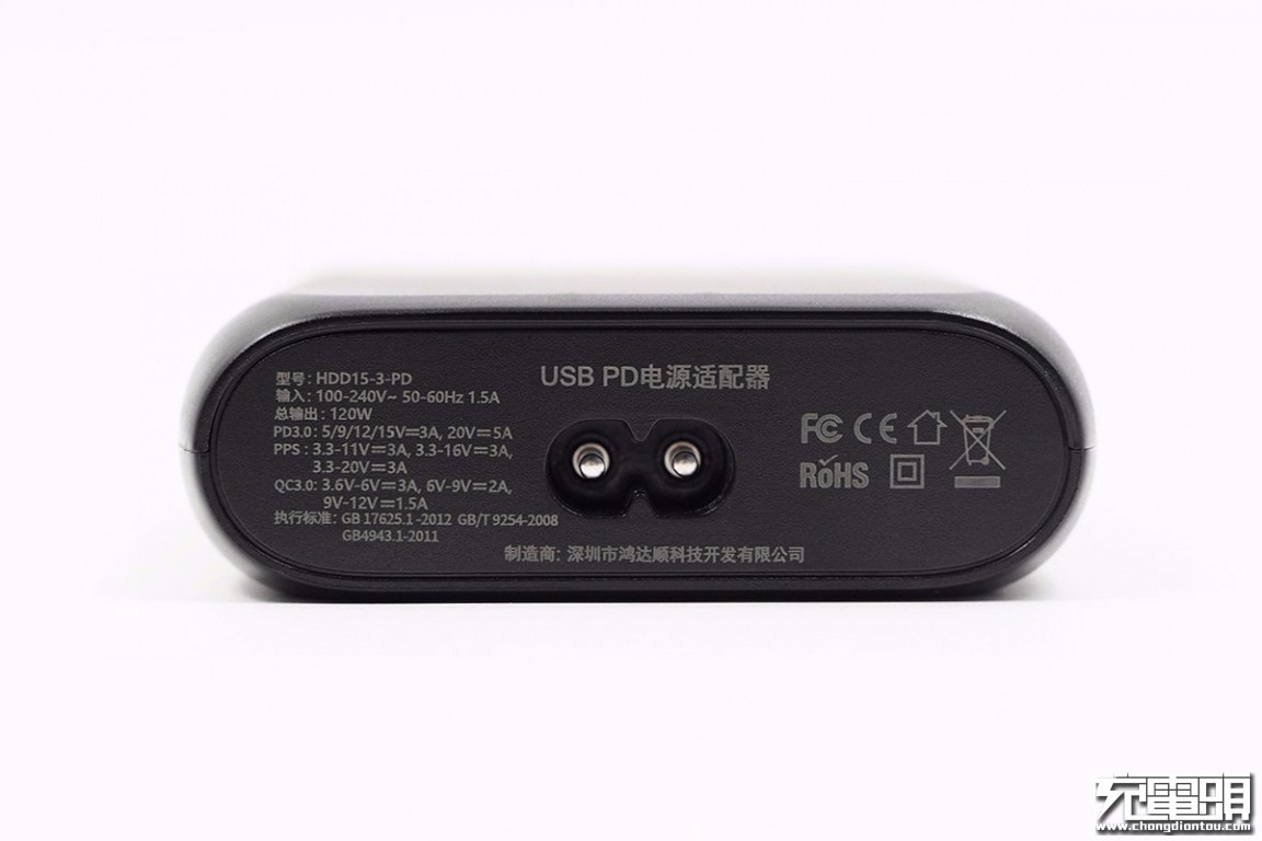 从外壳上丝印的参数信息可以看到,这款产品型号为HDD15-3-PD,支持100-240V~50/60Hz全球宽幅电压输入,在单口输出时,USB-C接口均支持5/3A、9/3A、12/3A、15V/3A、20V/5A;USB-A接口均支持3.6-6V/3A、6-9V/3A、9-12V/1.5A,产品的综合输出总功率为120W。制造商为:深圳市鸿达顺科技开发有限公司,并有FCC、CE、RoHS等认证标识。