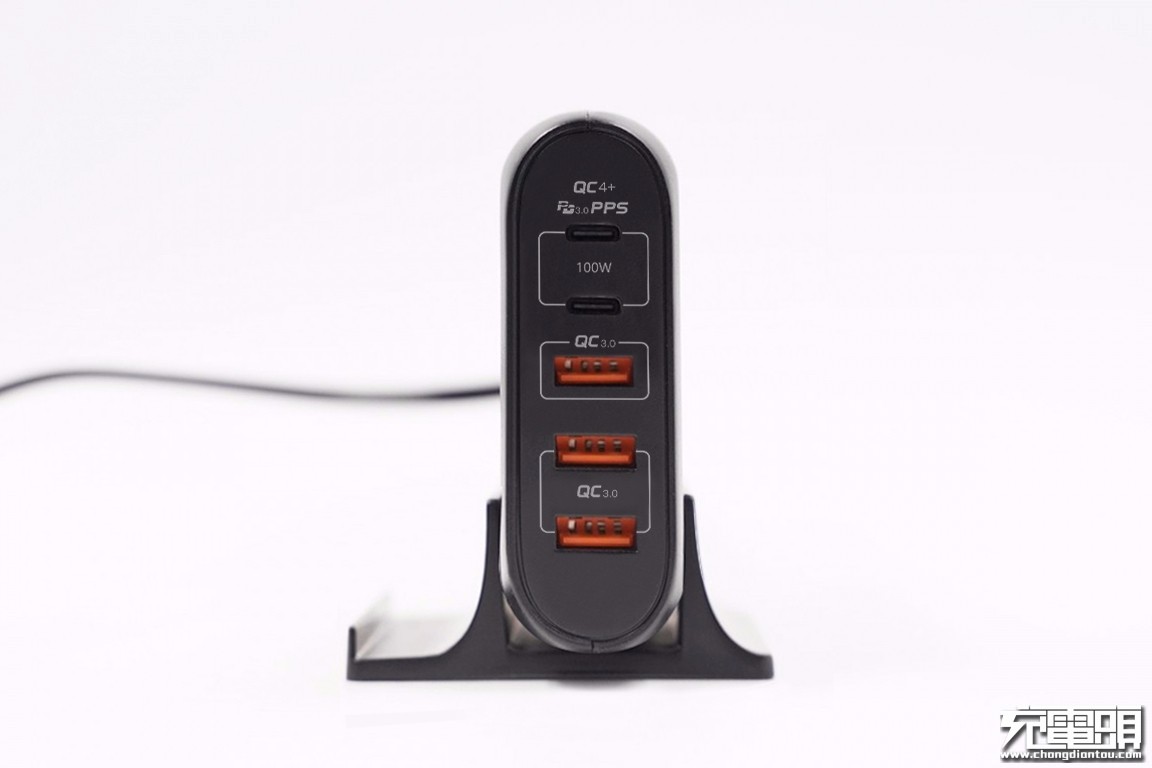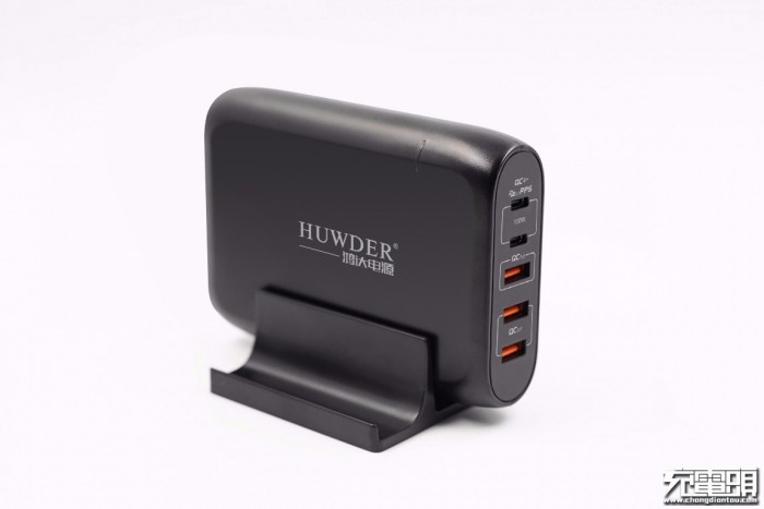 鸿达顺这款100W USB PD快充充电器采用扁平的外观设计,机身较为圆润。作为一款主打居家桌面使用场景的产品,其配备两个100W输出的USB-C接口以及三个支持18W快充输出的USB-A接口,以便满足多台设备同时充电器的需求。