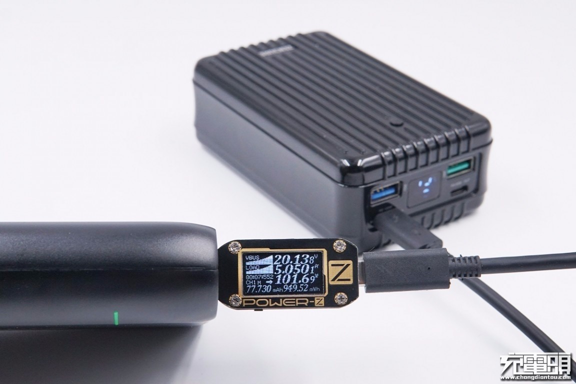 使用鸿达顺100W快充充电器给100W移动电源充电,ChargerLAB POWER-Z KM001C显示充电电压20.13V,电流5.05A,充电功率101.6W,成功进入100W USB PD快充模式。