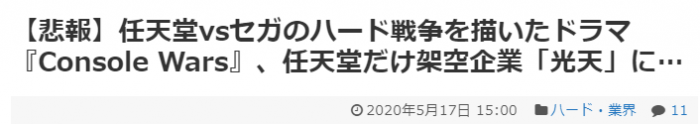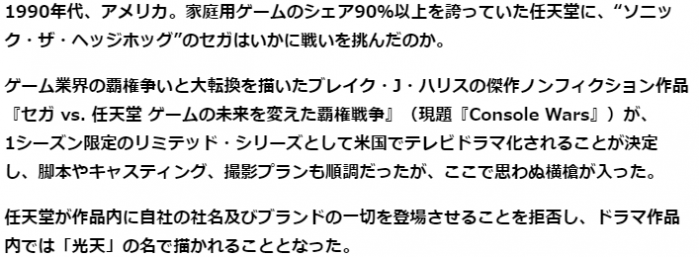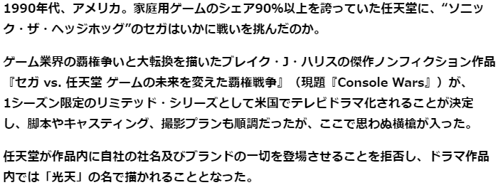 ·当时就有一部专门描写这场没有硝烟的主机战争纪实剧《世嘉VS.任天堂 改变游戏的未来的霸权战争》,不过据称受到任天堂的压力已经改名为《Console Wars》,而且任天堂法务部也迅速出击,拒绝剧中任天堂实名登场,不得已该剧只能将任天堂的原型会社改名为《光天》。