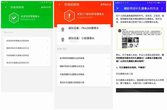 可见,尽管很多APP都有检测隐藏摄像头的功能,但时至今日仍未有百分百靠谱的方案。如果摄像头不发出红外光、位置隐蔽反光不明显、不连接Wifi网络、不带有强磁性,用APP很难检测到它。面对越来越泛滥的偷拍摄像头,大家还是需要提高警惕,如果发现什么异常,立即报警,才能切实保障自己的权益!