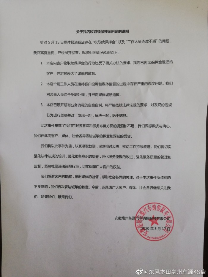 当日晚间,东风本田亳州东源4S店官方微博发布声明,对5月15日媒体报道的我店收取续保押金以及工作人员态度不当问题进行了调查,并通报了相关情况: