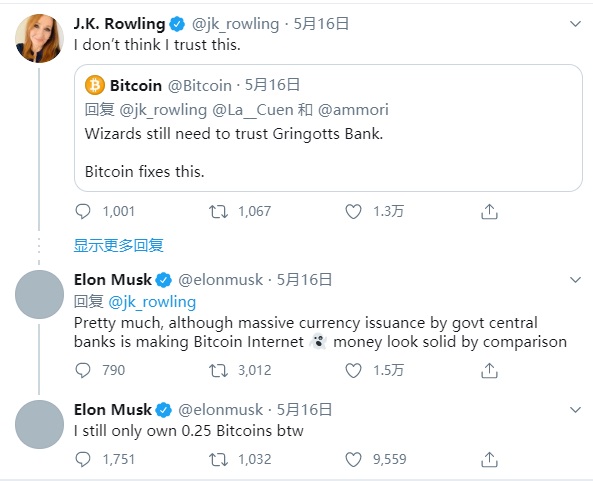 特斯拉CEO马斯克在社交网络上表示,相对于央行发行的货币,数字货币更可靠。近日,《哈利·波特》作者JK·罗琳在社交网络上表示,自己不相信比特币。马斯克表示了认同,但称相比之下,美国中央银行发行大量货币使得比特币这种网络货币看起来更稳定、可靠。