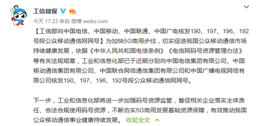 比如说,2019年12月24日,工信部发布通知,宣布向各大运营商核发公众移动通信网网号,其中中国电信获得190号段,中国移动获得197号段,中国联通获得196号段,而中国广电也获得了192号段。