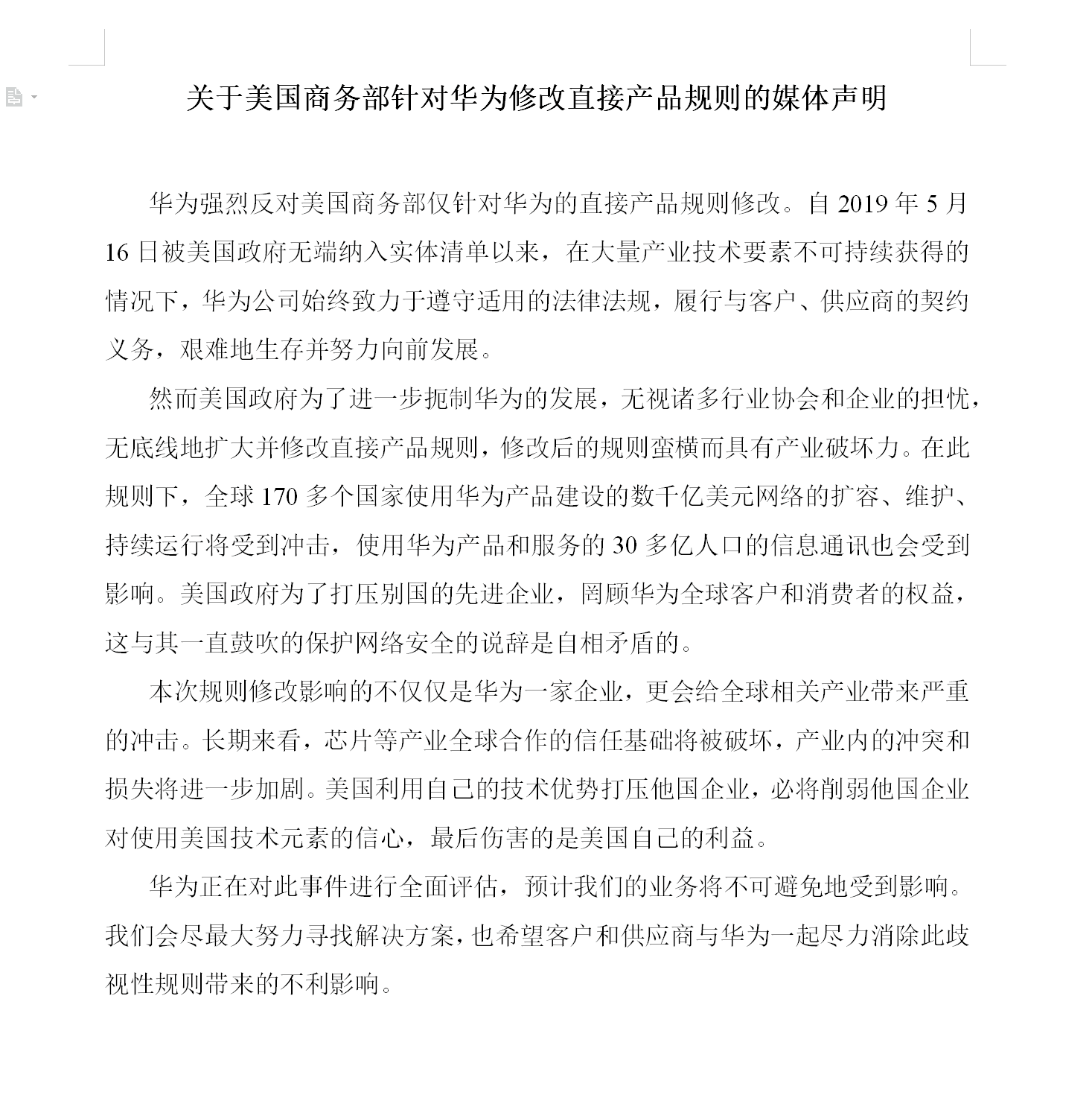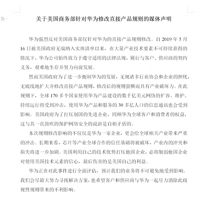关于美国商务部针对华为修改直接产品规则的媒体声明