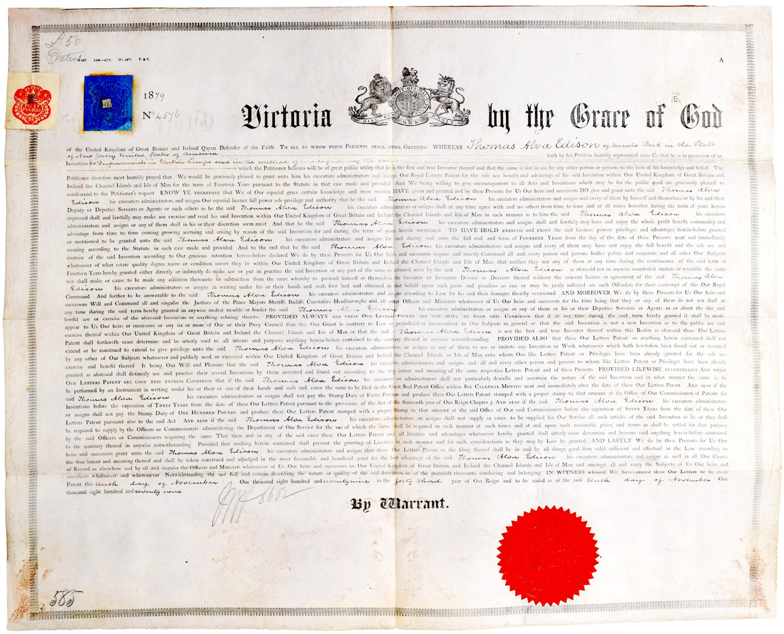 这一重要的收藏还包括约瑟夫·斯旺持有的四项专利,它们似乎是爱迪生-斯旺公司的欧洲专利档案,据悉,正是这家公司让电灯得以商业化。