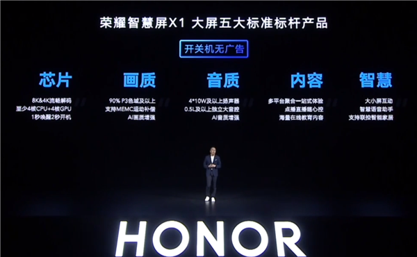 荣耀再次强调了智慧屏5大标准,包括芯片、画质、音质、内容及智慧,同时承诺开关机无广告。